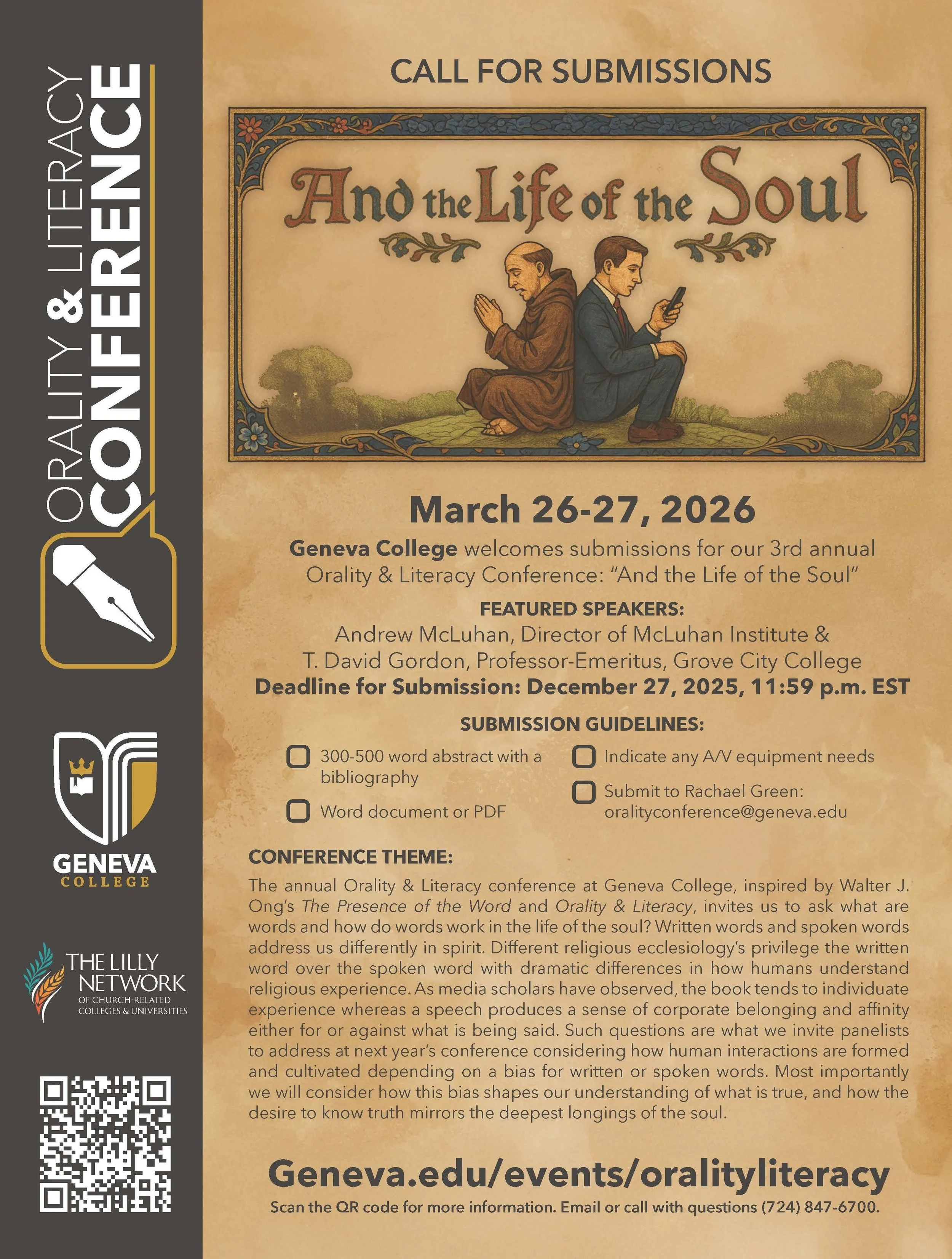 Paper proposal submissions should be a 300-500 word abstract with a bibliography. Abstracts can be submitted either as a Microsoft Word document or a PDF. Please email submissions to administrative assistant Blaine Gutberlet at btgutber1@geneva.edu. Please indicate in your proposal whether you would need any A/V equipment (essential equipment only, please).